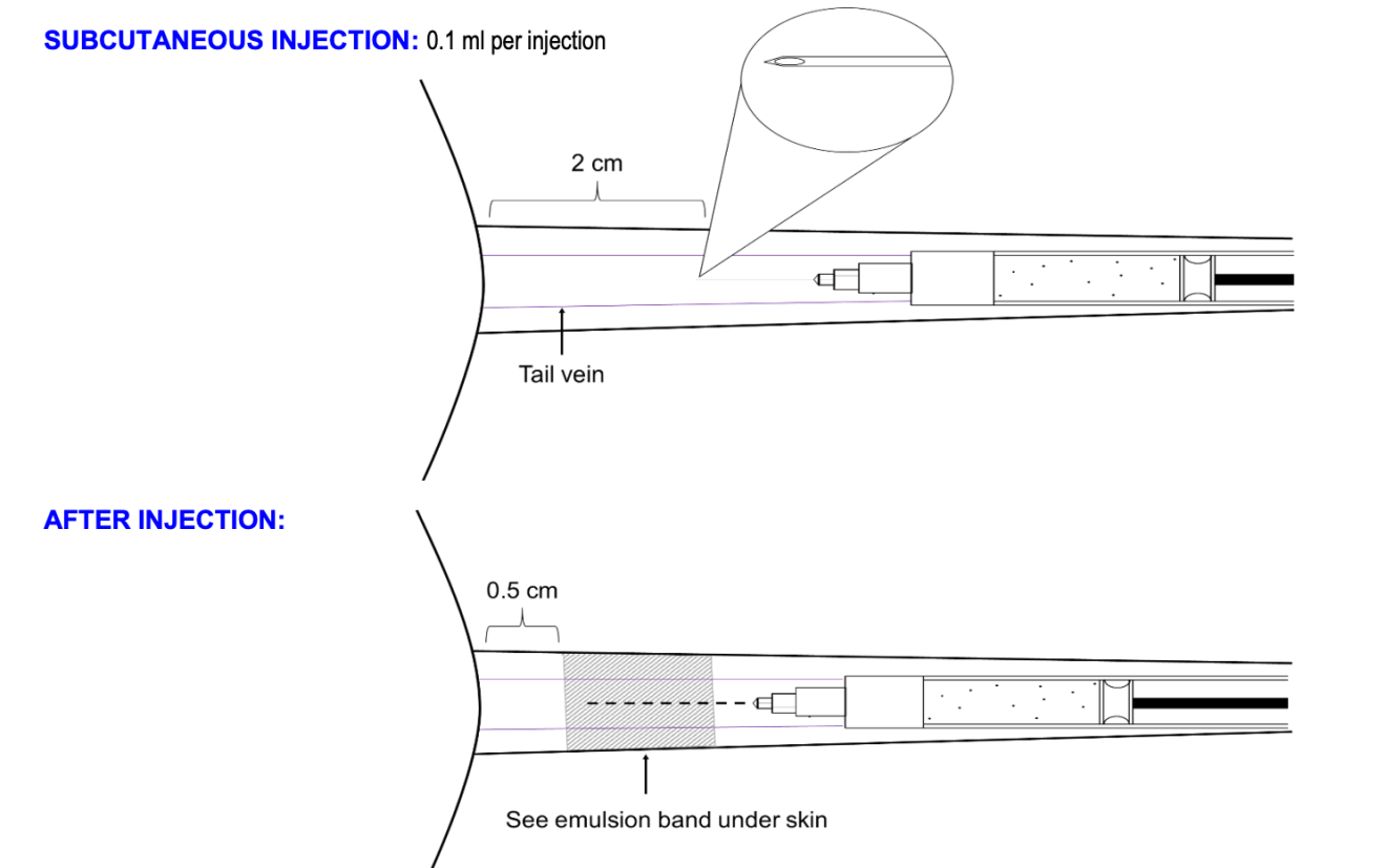Note: Insert the needle between the tail veins to avoid accidental injection into the bloodstream.