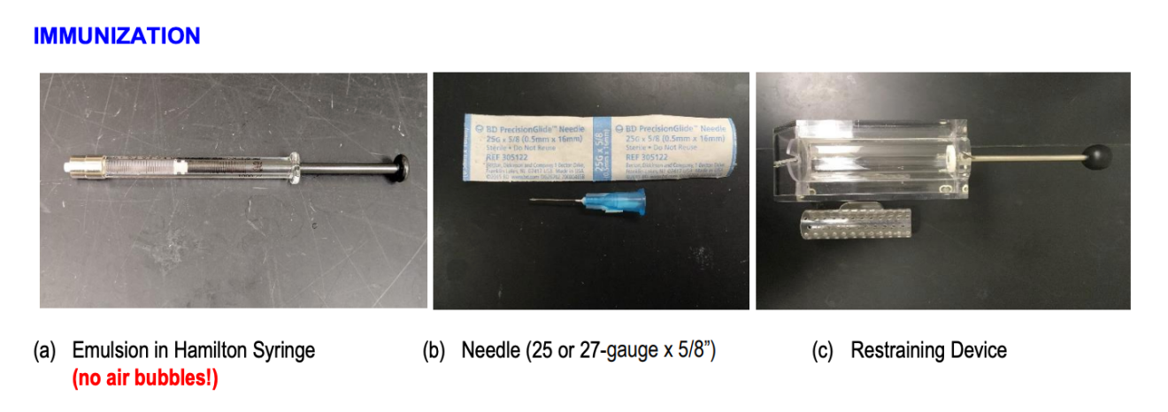 1. Place a 25 or 27-gauge x 5/8” needle on the Hamilton syringe. Before each injection, wipe the needle to prevent leakage of the emulsion.